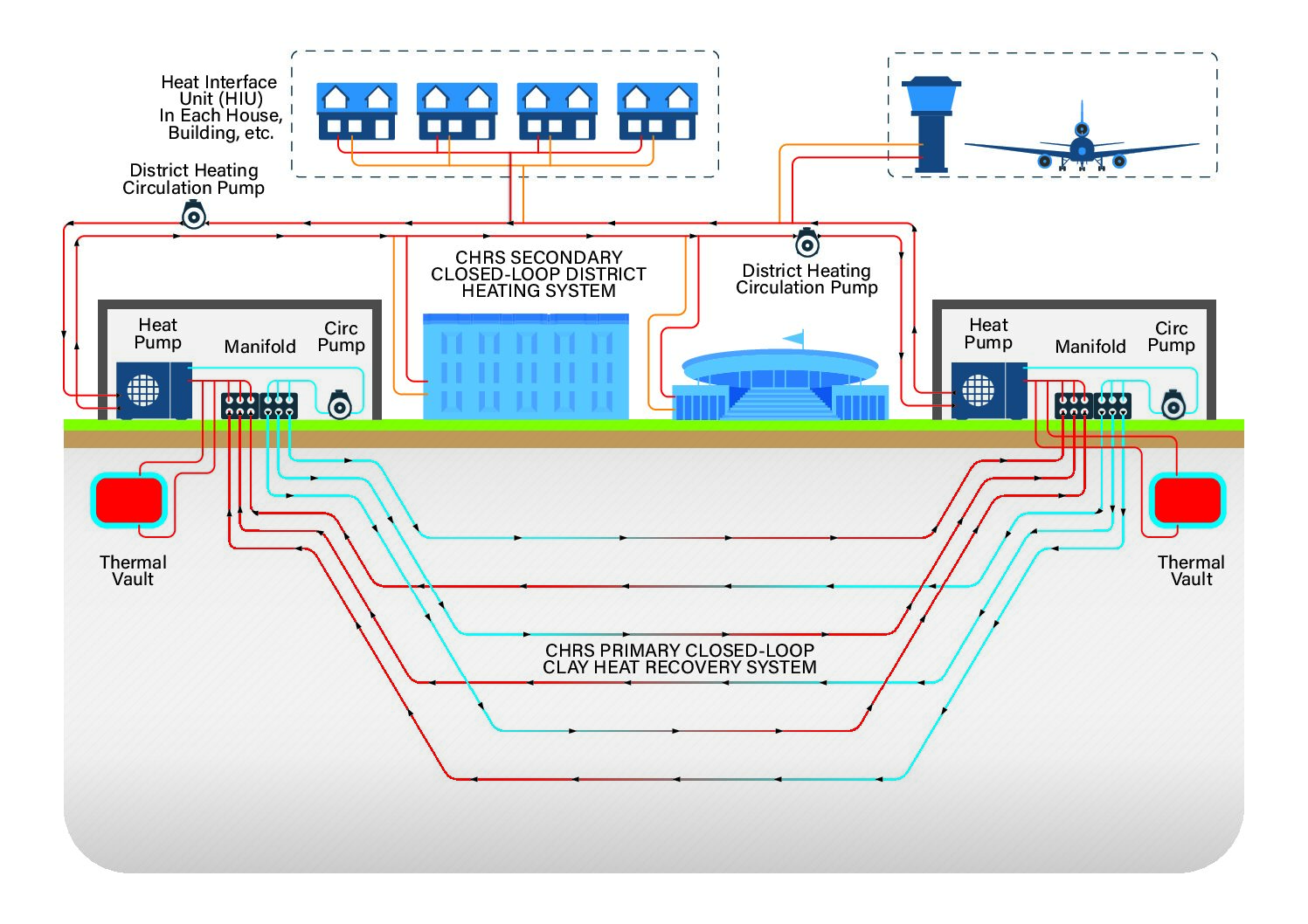 - Optionally run chilled CHRS Fluid™ to remove excess clay heat during heatwaves and can be employed in underground tunnels.